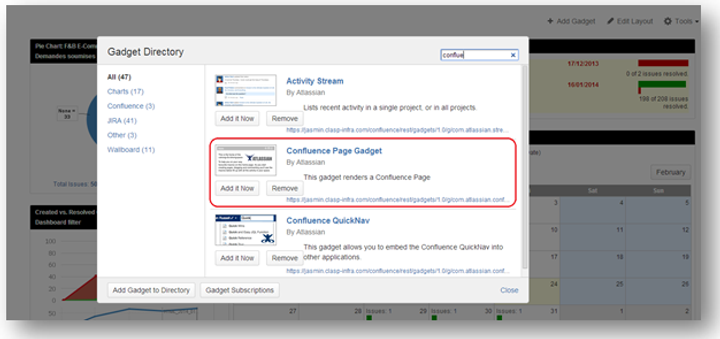 The data collated and expressed by these reports can also be displayed within the Confluence pages themselves. JIRA Gadgets can make detailed charts and reports available to users as they view specific Confluence pages.
